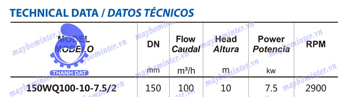 Bảng mô tả chi tiết thông số kỹ thuật của máy bơm chìm nước thải INTER 150WQ100-10-7.5/2 7.5KW 10HP
