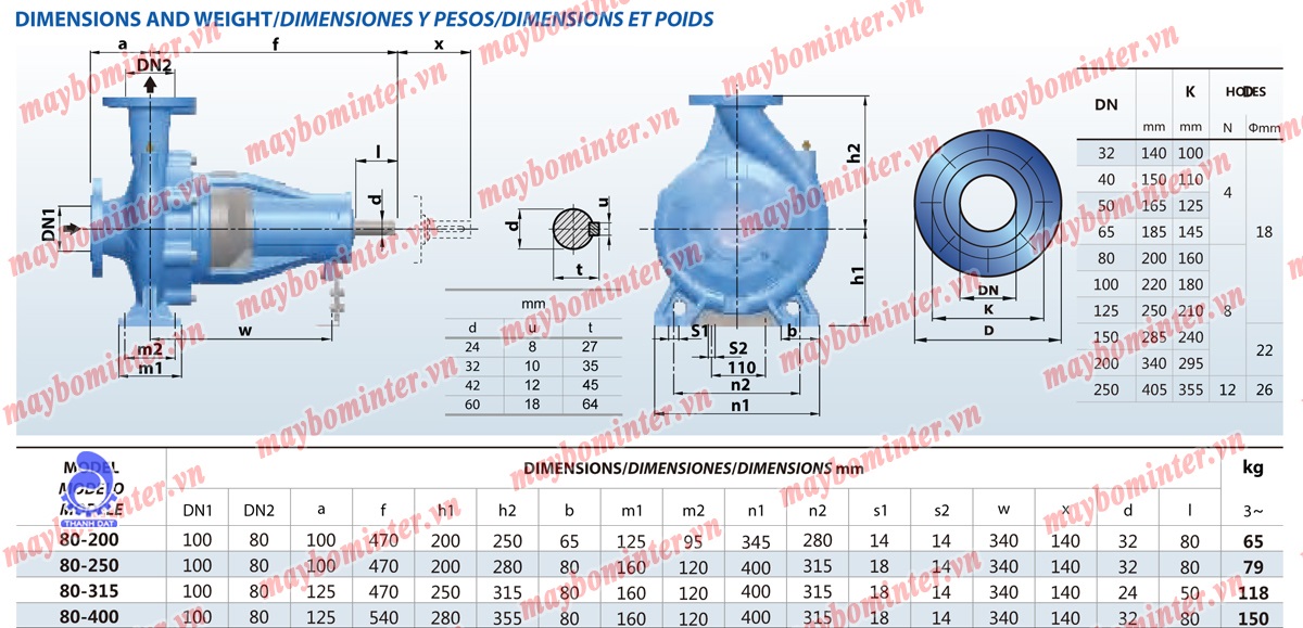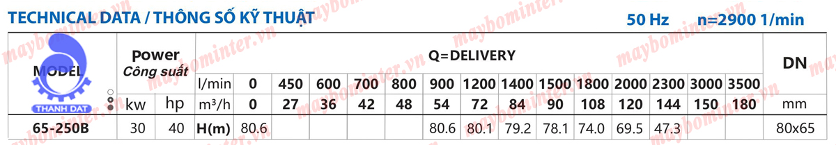 Bảng thông số kích thước của đầu bơm INTER CA65-250B 40HP