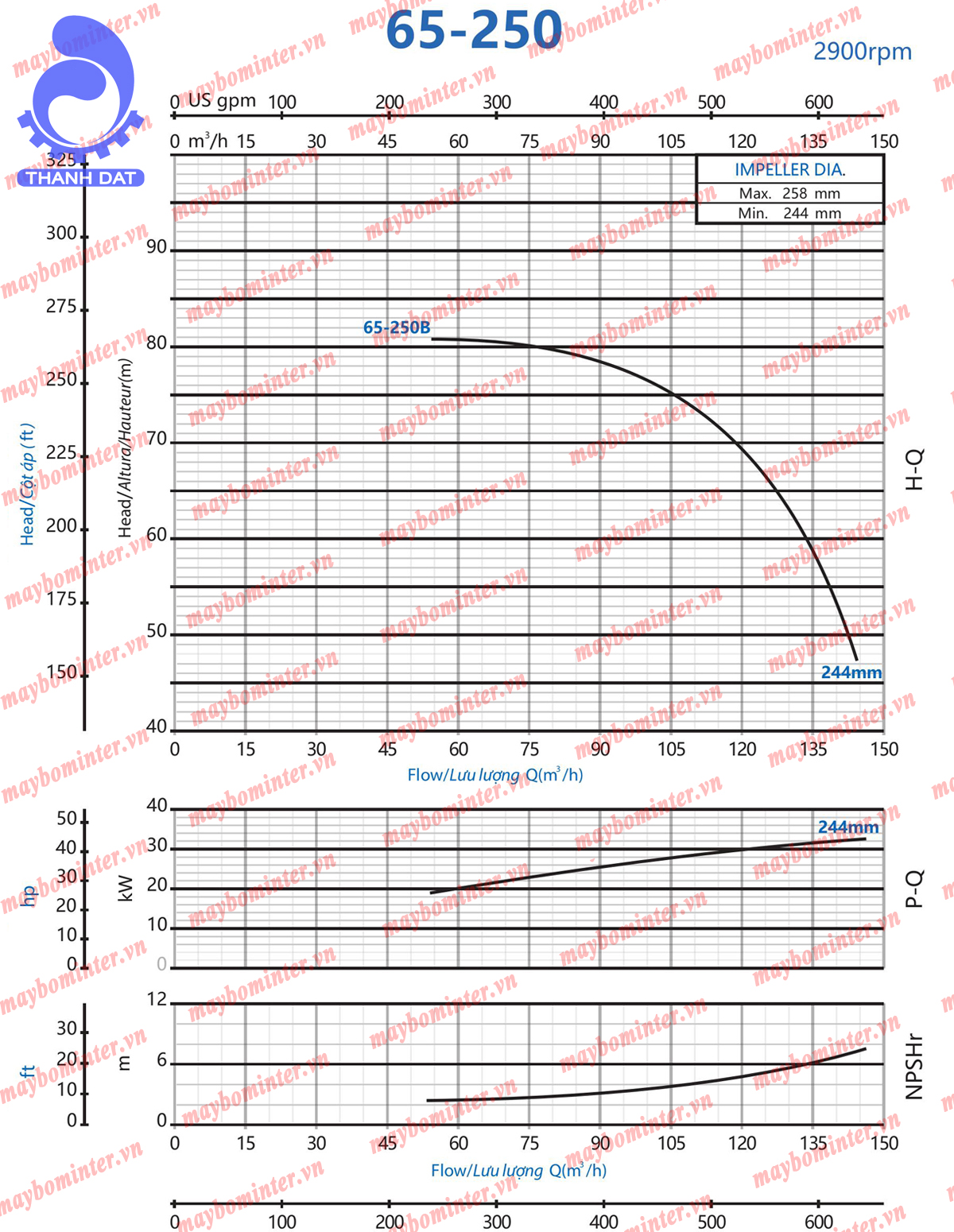 Bảng biểu đồ lưu lượng của máy bơm chữa cháy diesel 30KW INTER CA65-250B 40HP