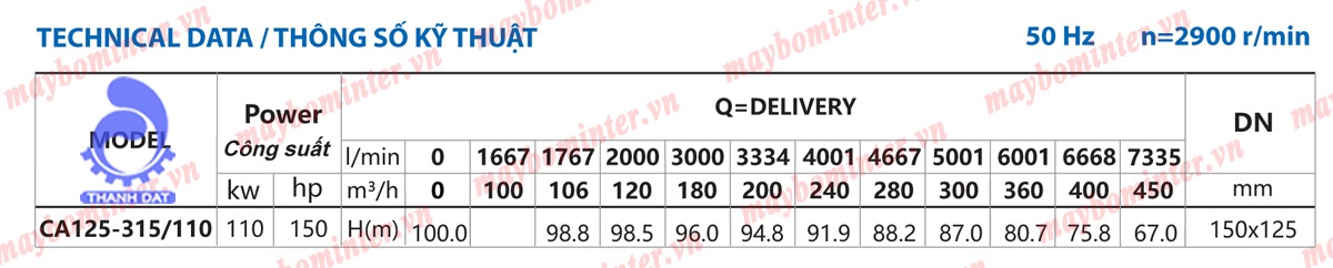 Bảng thông số kích thước của đầu bơm INTER CA125-315/110 150HP