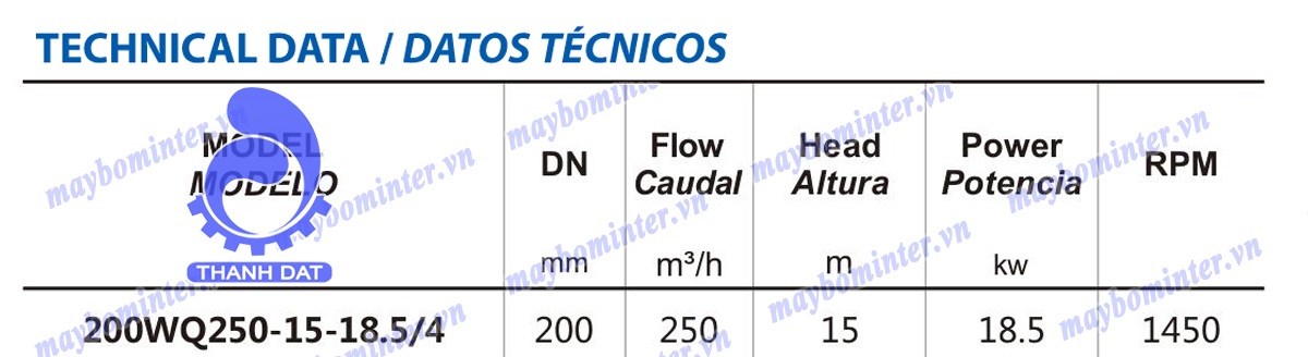Bảng mô tả chi tiết thông số kỹ thuật của máy bơm nước thải INTER 25HP 200WQ250-15-18.5/4 18.5KW