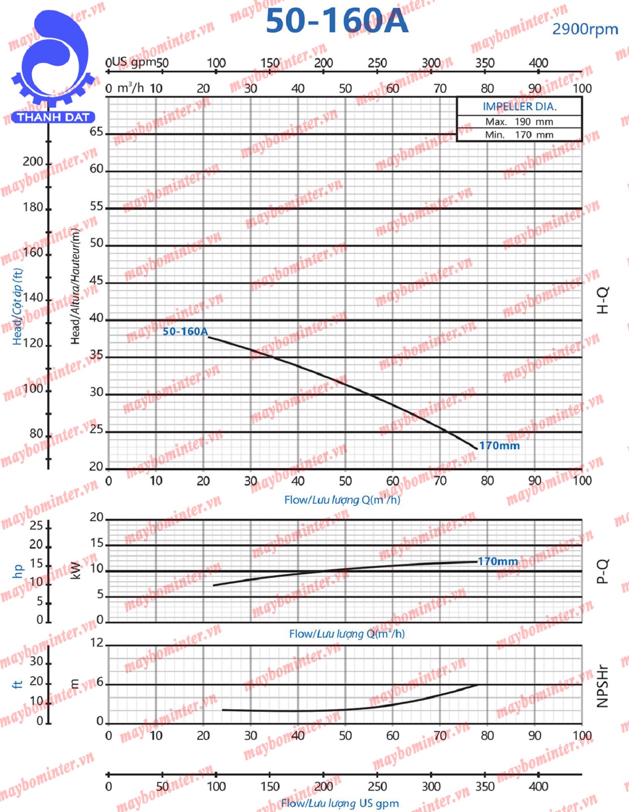 Bảng biểu đồ lưu lượng cột áp của máy bơm nước chữa cháy diesel 10HP INTER CA50-160A 7.5KW