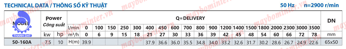 Bảng thông số kỹ thuật của máy bơm nước chữa cháy diesel 10HP INTER CA50-160A 7.5KW