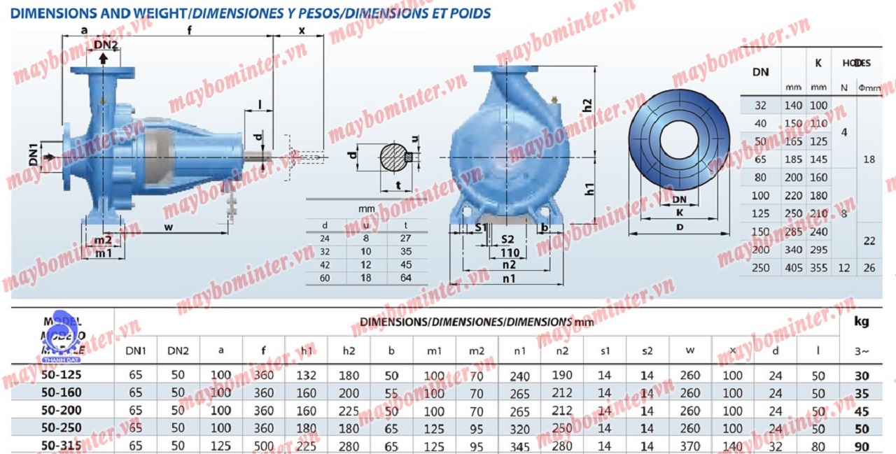 Bảng thông số kích thước của đầu bơm INTER CA50-160A 7.5KW
