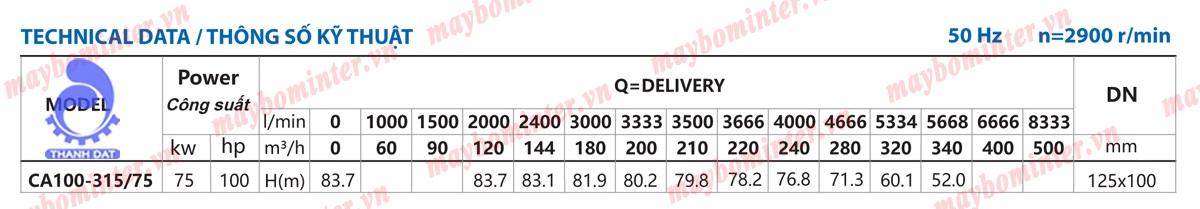 Bảng thông số kỹ thuật của máy bơm nước chữa cháy diesel 75KW INTER CA100-315/75