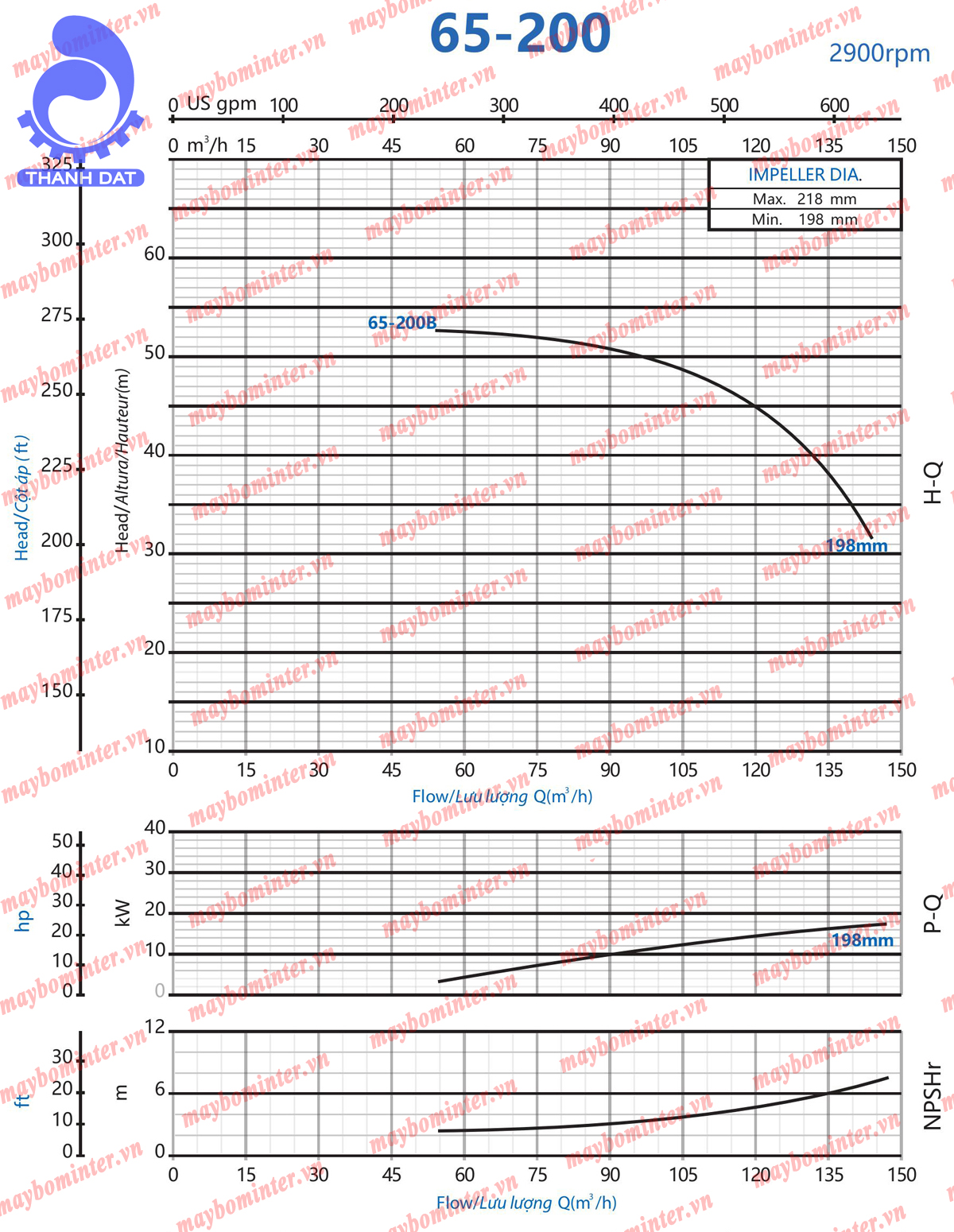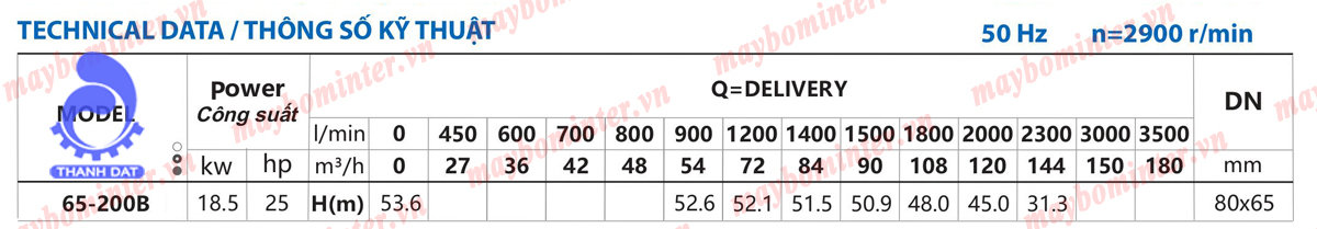 PBảng biểu đồ lưu lượng của máy bơm nước cứu hỏa diesel 25HP INTER CA65-200B 18.5KW