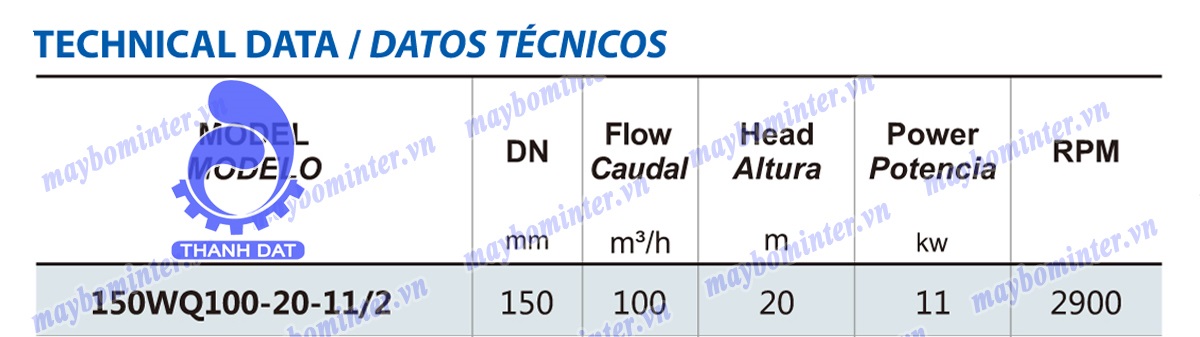 Bảng mô tả chi tiết thông số kỹ thuật của máy bơm nước thải 11KW INTER 150WQ100-20-11/2 15HP