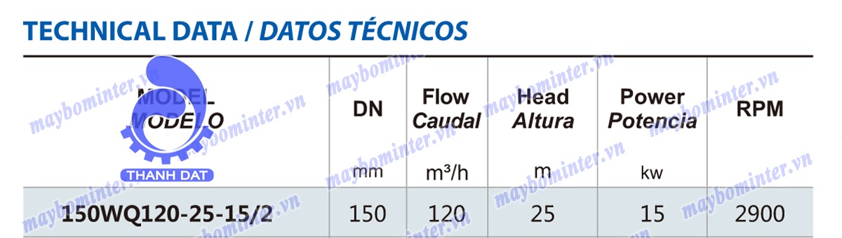 Bảng mô tả chi tiết thông số kỹ thuật của máy bơm nước thải 15KW INTER 150WQ120-25-15/2 20HP