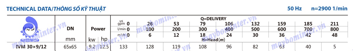 Bảng thông số kỹ thuật của máy bơm nước trục đứng INTER IVM 30×9/12 9.2KW 12.5HP