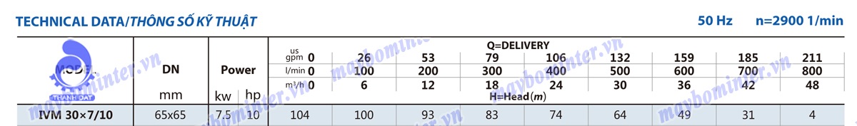 Bảng thông số kỹ thuật của máy bơm trục đứng INTER 10HP IVM 30×7/10 7.5KW