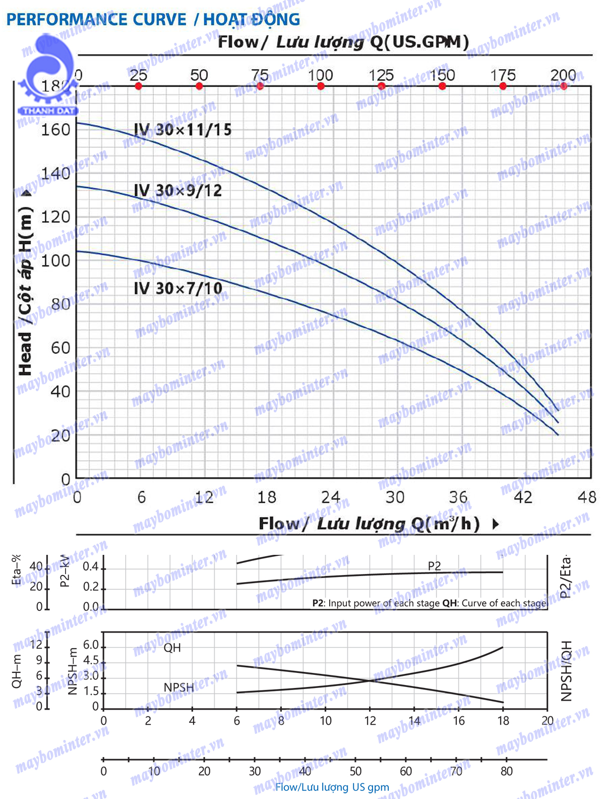 Bảng biểu đồ lưu lượng cột áp của máy bơm trục đứng INTER 10HP IVM 30×7/10 7.5KW